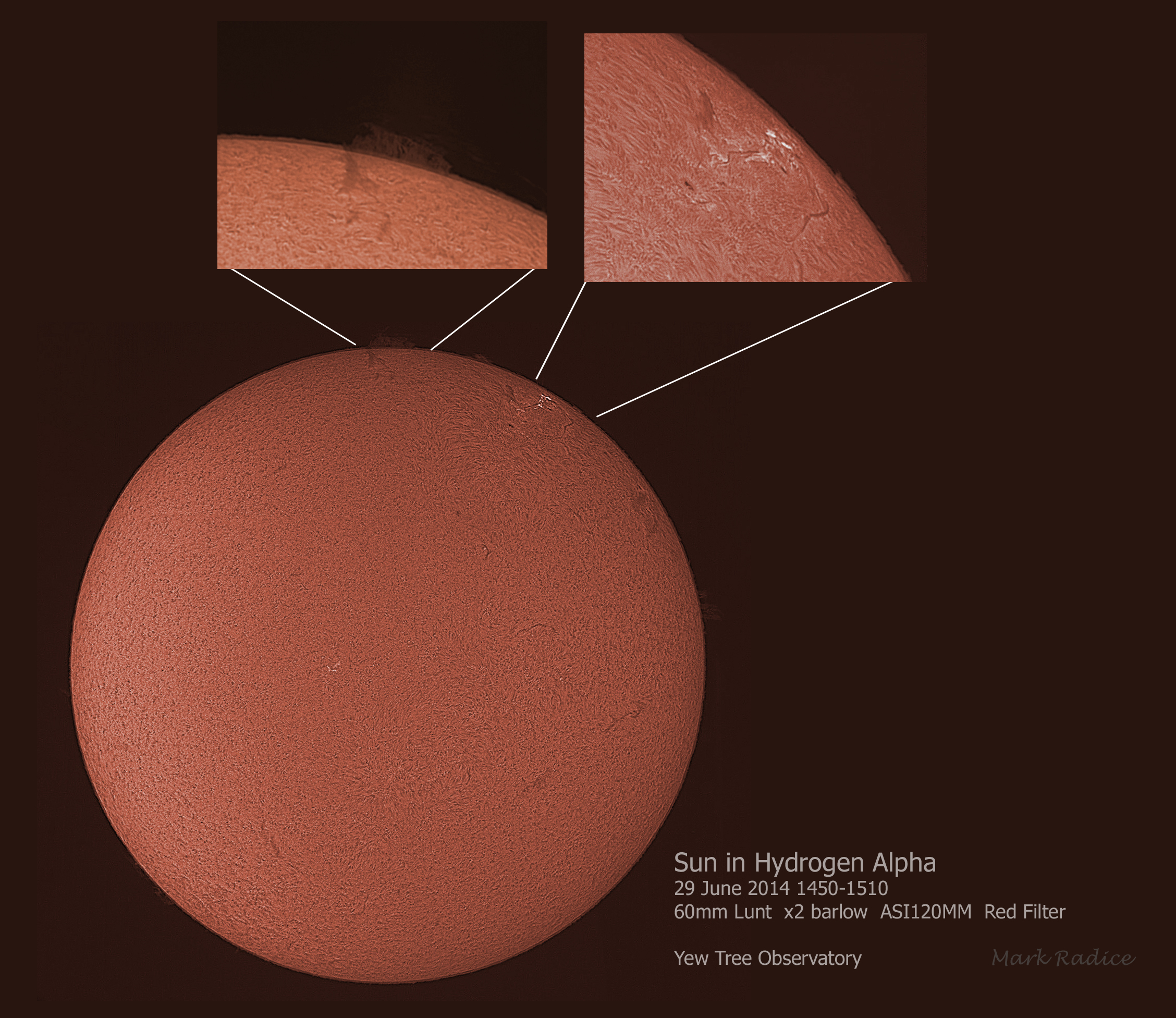 Fine, settled weather has arrived over the UK bathing us in soaring temperatures and glorious sunshine. As the hordes descend to the beaches and light their bbq, I set up the solar scope and enjoyed some sunspots. I think I melted as it was so very hot – especially having to work under a dark blanket to see the computer screen! After the montage below, I took a picture of an interesting sunspot group every 2 minutes for 40 minutes and caught a small flare erupting. The video is 2 mins = 1 second from 1611 to 1650Z.